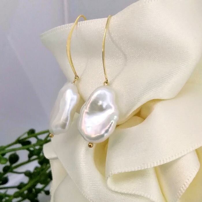 大振りのバロック淡水真珠が揺れる、個性的なフックタイプのピアスです。