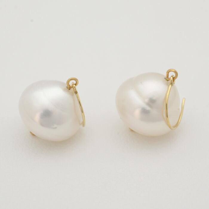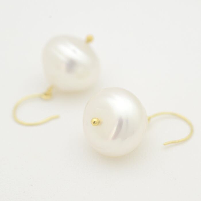 コロンとしたしずく型の南洋真珠が耳元で揺れる、大人可愛いピアスです。