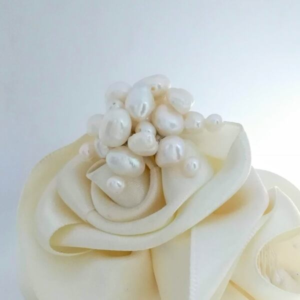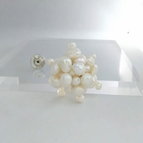 形がシャワーヘッドに似ていることから、この名前が付いたようです。シャワーのように開いている穴にテグスを入れて、真珠を一粒一粒通して、留めていきます。大きさ違いの淡水真珠を使用した細やかな作りのブローチです。